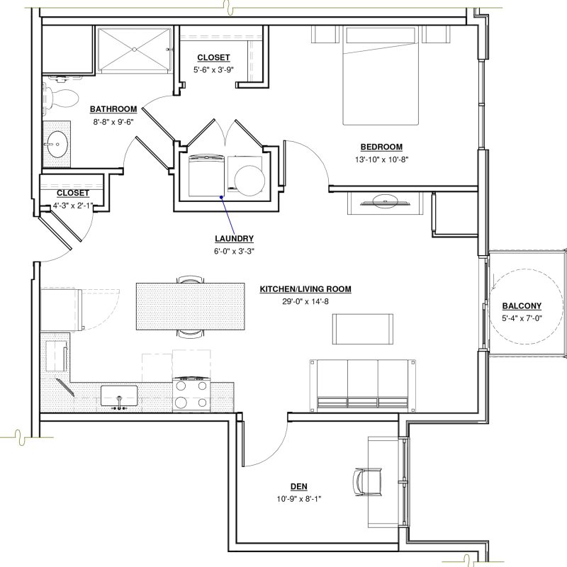 1 BR + Den · 1 Bath · 888 SF